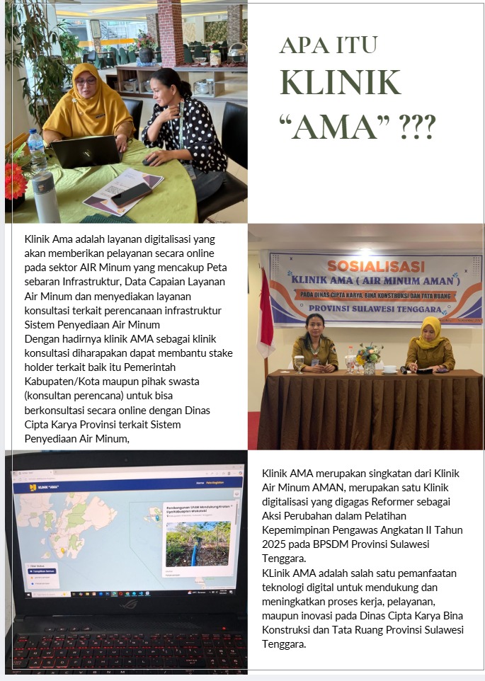 Aplikasi Klinik AMA dikembangkan oleh Indrayati Bulo, ST., MT., Kepala Seksi Pengembangan SPAM dan PLP, sebagai bagian dari Aksi Perubahan dalam Pelatihan Kepemimpinan Pengawas (PKP) Angkatan II Tahun 2025 yang diselenggarakan oleh BPSDM Provinsi Sulawesi Tenggara.