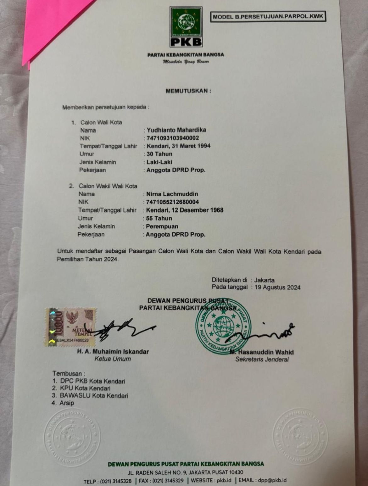 Itu menyusul diterbitkannya Surat Dukungan model B1KWK yang diteken langsung Ketua Umum PKB H.Muhaimin Iskandar dan Sekjen M.Hasanuddin Wahid di Jakarta per tanggal 19 Agustus 2024.